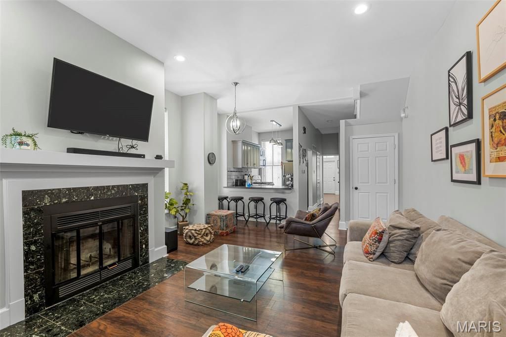 This historic 3 bed, 2 bath home located in the Lafayette Square neighborhood welcomes you to this 2 story beauty. 10' ceiling and wood engineered floors create a graceful elegance with a marble fireplace being the focal point in the living room. The kitchen adjoins the living space with a breakfast bar, stainless appliances, custom tiled backsplash and custom cabinetry creating a sleek appearance. A bedroom with access to the deck and a convenient half bath complete the main level. Upstairs, the spacious primary bedroom offers a large walk-in closet, with a second bedroom that leads out to the upper deck. A full bath is included on the upper level. The lower level has a finished recreation room and a dedicated utility room, along with plenty of room for storage. Enjoy the privacy of the fully fenced in backyard with 2 decks and a 2 car parking pad. Experience all that Layette Square has to offer including dining, microbreweries, boutique shopping and Lafayette Park.